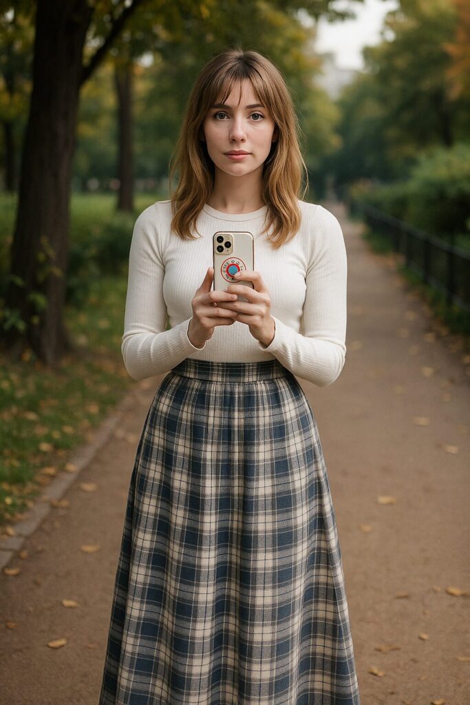 白のリブトップス × グレーチェックのロングスカート を合わせた、冬のナチュラル細見えコーデ。