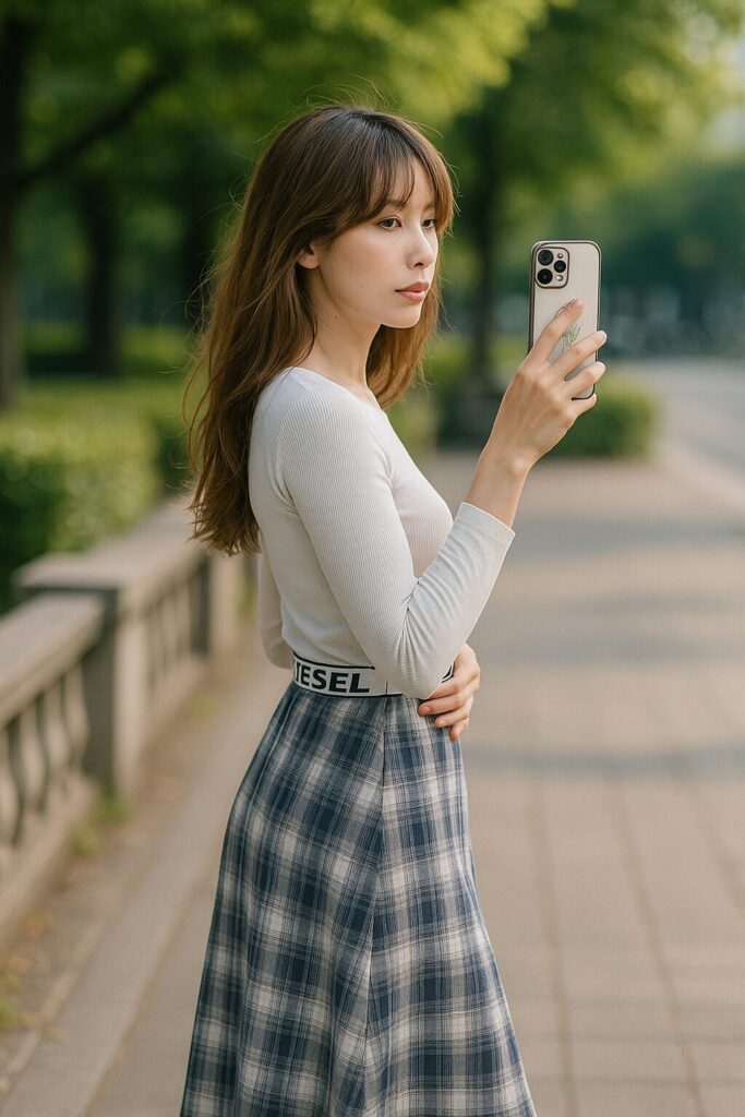 白トップスの明るさ スカートの柄の細かさ 影の出方による細見え