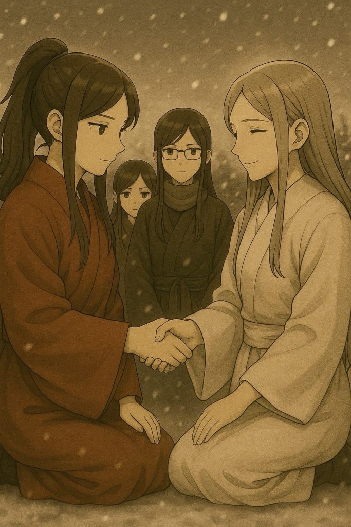 情景:雪が舞う中、信玄と謙信が互いに手を結ぶ。