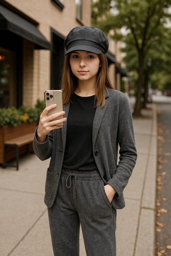 🎩 黒キャスケット 👚 黒インナー(タイトめ) 🧥 薄グレーのジャケット 👖 グレーのジョガーパンツ