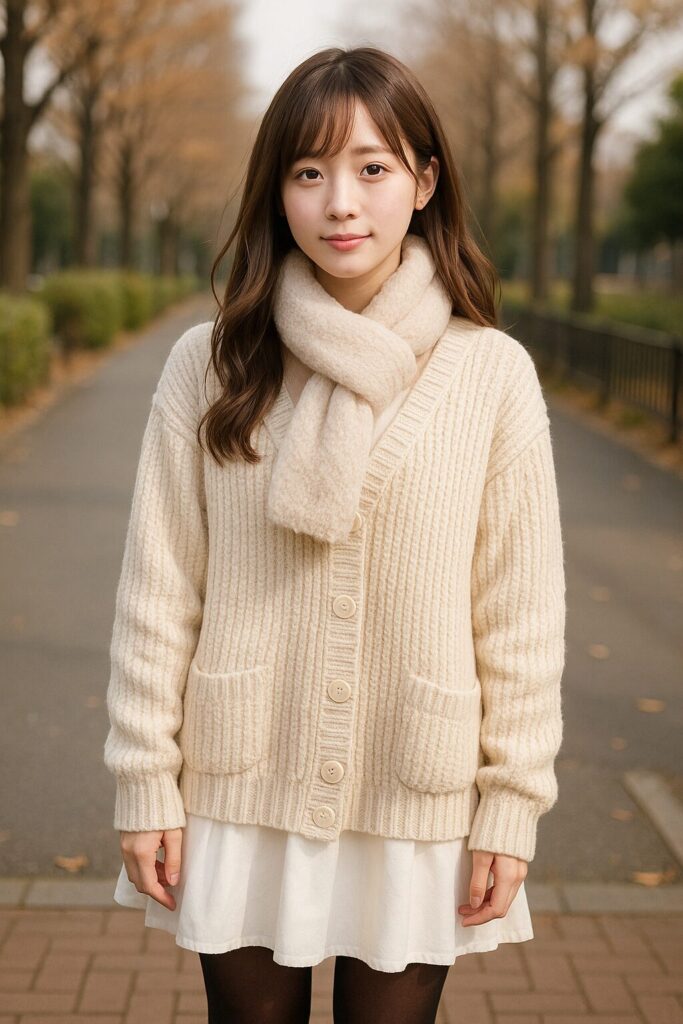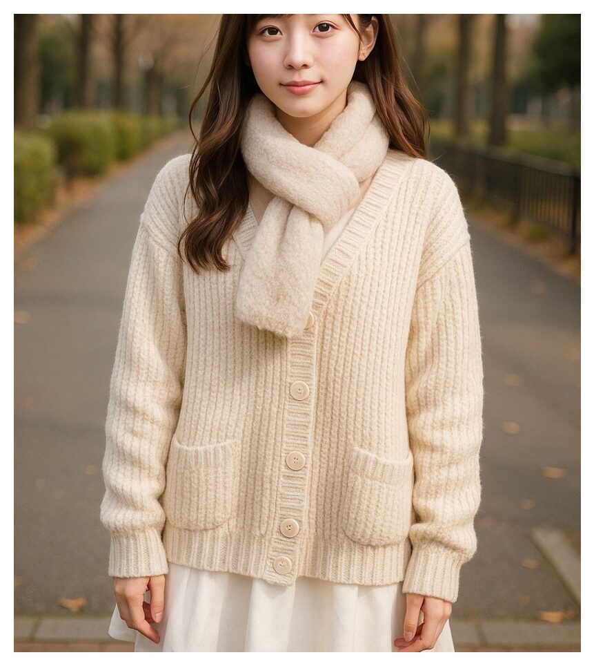 【画像②:カーディガンの質感アップ】